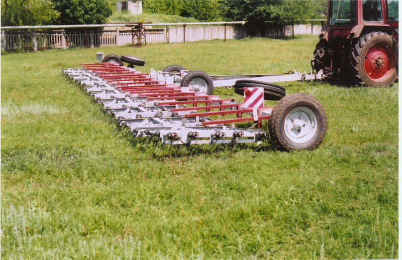 Применяется для ранневесеннего боронования зяби, озимых посевов, довсходового и послевсходовового боронования и обработки пашни, вворачивания минеральных удобрений, закрытие влаги, обработки стерни (сбор соломы, сена в валки). Конструкторская особенность предусматривает два положения - рабочее и транспортное, что гарантирует высококачественное боронование больших площадей, находящихся в разных местах без использования дополнительных подьемно-транспортных устройств и механизмов. Регулирование угла атаки зубов дает возможность изменять глубину рыхления от 2-х до 9-ми сантиметров. Уменьшение расстояния между отдельными бороздами (зубового поля), совместно с вибрацией пружинных зубов обеспечивает почти 100 % уничтожение поросли сорников в фазе белой нитки. не менее 25 Рабочая скорость по основным операциям до 12 Глубина рыхления (см) от 2 до 9 Численность персонала по профессиям, неоходимых для обслуживания 1 тракторист Транспортная скорость (км/час) до 32 Масса агрегата, (кг не больше) без борон/с боронами 1700 / 2850 Длина с боронами в рабочем положении, мм 8320 Длина без борон, мм 7620 Ширина, мм 24 400 Высота, мм 915 Трудоемкость соединения сцепки с трактором (человекочасов) 0.14 Трудоемкость соединения с боронами (человекочасов) 1 Соединение с тракторами класса 3-5 т.с. тяги Т-150 (К), К-701, ХТЗ-12