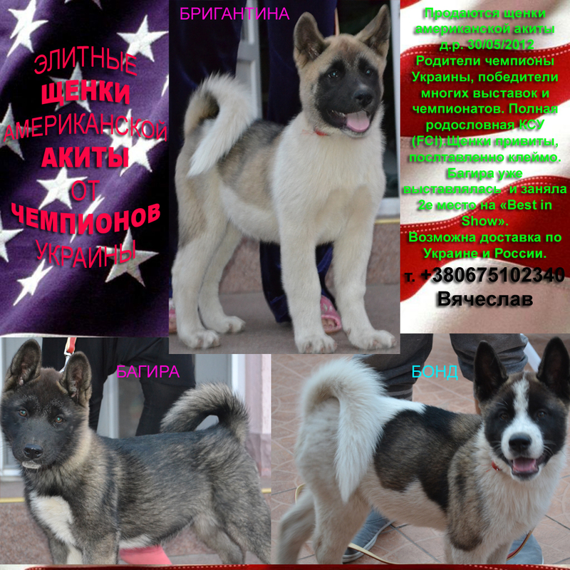 К продаже предлагаются элитные щенки американской акиты для выставок, разведения, хороших семей и сильных мужчин. У нас подрастают 2 девочки и 1 мальчик д.р. 30/05/2012.Собаки идеальны для охраны, охоты и маленьких детей. Родители неоднократные победители выставок и чемпионатов, чемпионы Украины . Полная родословная КСУ –FCI. Плановая вязка. У щенков поставлено клеймо ,сделаны прививки. Вет паспорт и щенячка прилагается. Одна девочка уже выставлялась и заняла 2е место на «Best in Show»
