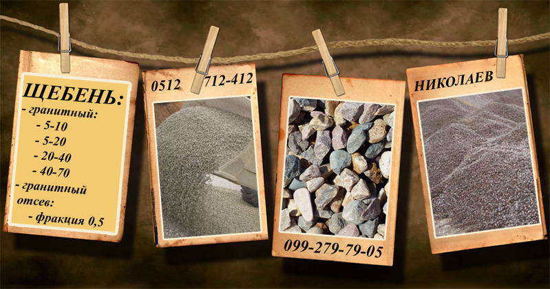 Щебень: всех фракций (гранитный: 5-10, 5-20, 20-40, 40-70) и гранитный отсев (фракция 0,5). От 150 грн/т. Опт и розница. Доставка и продажа по Николаеву и области. 099-279-79-05 063-976-76-05 (0512) 712-412 |