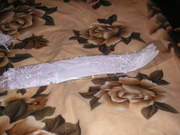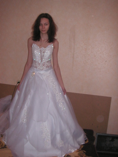 Новое очень красивое платье, для настоящей принцессы! Нежное, богатое, но не наляпистое, украшено вышивкой и стразами. Корсет ниже талии, плотный,хорошо скрывает животик, сзади на молнии и завязках. Атласная юбка, поверх крылья нежного, легкого фатина, придающего воздушность... разбросаны вышитые цветы.... Справа на юбке шикарная "брошь". Платье можно одевать с подъюбником и без, Вместе с платьем идет подьюбник на 2 кольцах, фата, перчатки и украшения. Размер 42--48. Звоните 093 8277268. Ирина. P.S: в жизни оно гораздо лучше чем на фото! |