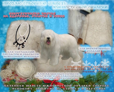 Шерсть белая, длинная, шелковистая подготовлена к прядению. Для изготовления нарядных и теплых вязанных изделий-свитеров,шапочек,шарфиков,варежек,лечебных жилетов,поясов от радикулита.А так же различных украшений,декоративных элементов,войлочных игрушек и т.д. Стоимость договорная. |